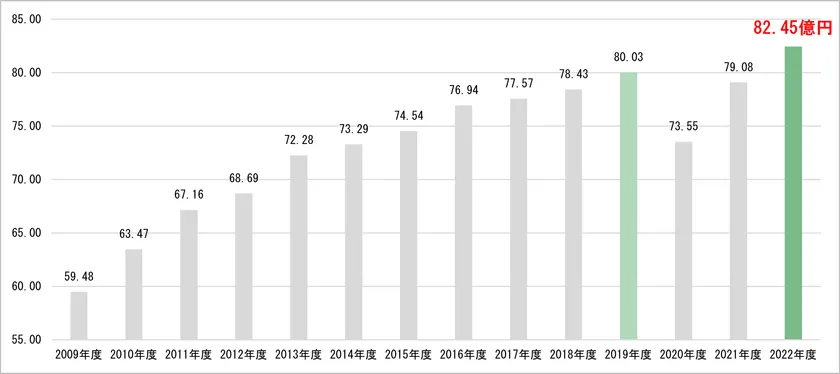 マルヤマクラスは2009年に開業、当初は約59.4億円だった売上が10年連続で増収し2019年度には80.03億円を突破。2020年度は新型コロナウイルスの影響をうけながらも73.55億円と1割ほどの減少にとどまり、2021年度はコロナ前に迫る79.08億円まで回復。2022年度はついにコロナ前の2019年度に記録した最高売上を更新しました。