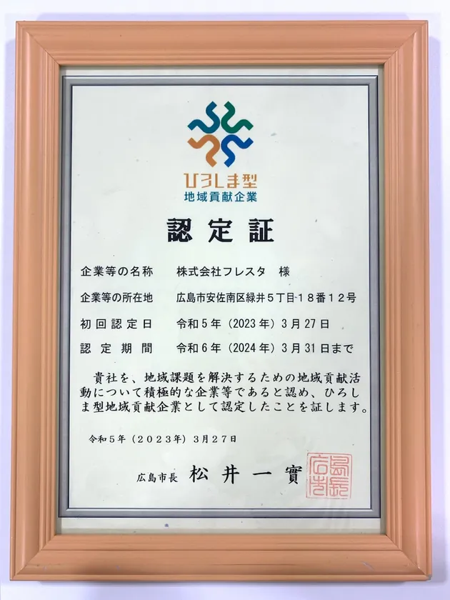 株式会社フレスタ(広島県広島市、代表取締役社長:谷本 満、以下 当社)は、広島市が掲げる「広島市地域コミュニティ活性化ビジョン」に基づき制定された、「ひろしま型地域貢献企業認定制度」において、地域貢献活動について積極的な企業であると認められ、ひろしま型地域貢献企業として認定を受けました。