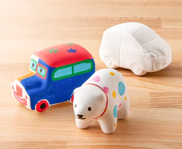 手のひらサイズの真っ白い陶器でできた車や動物などに色や絵を描き、オリジナルの陶器をお作りいただけます。