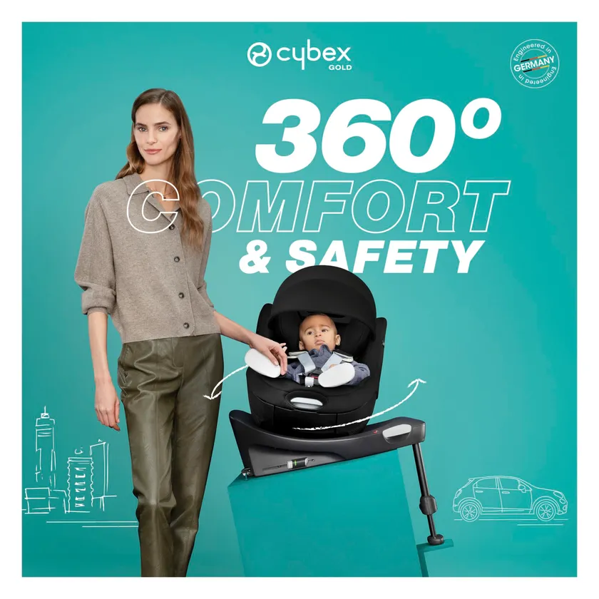 台座を低くデザインする独自技術で、チャイルドシートの座面から車の天井までの距離を大きく確保している点は、既に高く評価されているCYBEXの美点の一つ。新しいシローナでは更に、どのリクライニング角度でもシートの回転が可能になり、乗せ降ろしがよりスムーズになりました。