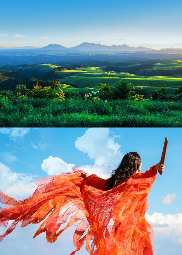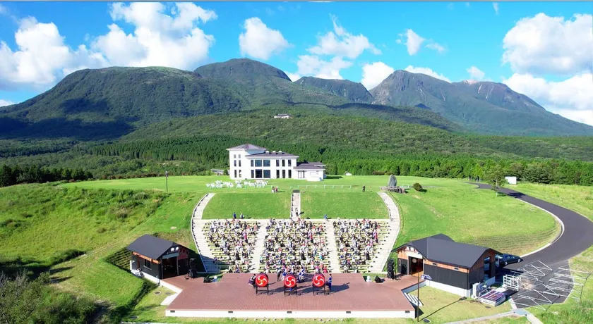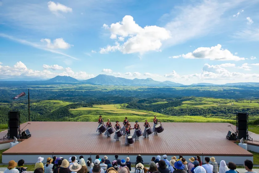 舞台背景は、阿蘇くじゅう国立公園のダイナミックな自然。1,000年前から行われていると言われる「野焼き」の効果で、どこまでも美しい草原が続き、40kmほど先にある阿蘇の五岳までほとんど建造物も見えない…。そんな景勝地に、世界で活躍する和太鼓エンターテイメント集団「DRUM TAO」の舞台が楽しめる空間があります。