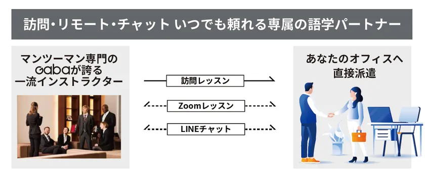 そこで、株式会社GABAは、いつでも、どこでも、高品質なマンツーマン英会話レッスンが受けられる、講師出張型の英会話サービスを新たにスタートいたします。Gabaが誇る一流インストラクターのマンツーマンレッスンはそのままに、オフィスへの訪問とオンラインレッスンの自由選択、スマートフォンから気軽に予約できる予約システム、いつでも相談できるLINEチャットサポートなど、お忙しいVIP層のニーズに寄り添った、利便性の高いサービスの提供を目指してまいります。