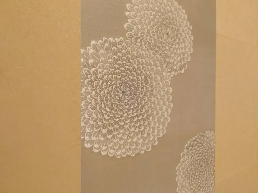 今回は、280年を超える歴史を誇る京都の帯匠「誉田屋」の十代目当主・山口源兵衛により、プラチナの糸で織られた八重菊の文様が入った作品が新たに設置されました。制作にあたっては「菊は湯の友」という発想を起点とし、湯の香りに菊花を添える趣向にまかせて伊藤若冲の「菊花流水図」にインスピレーションを得た作品となっています。