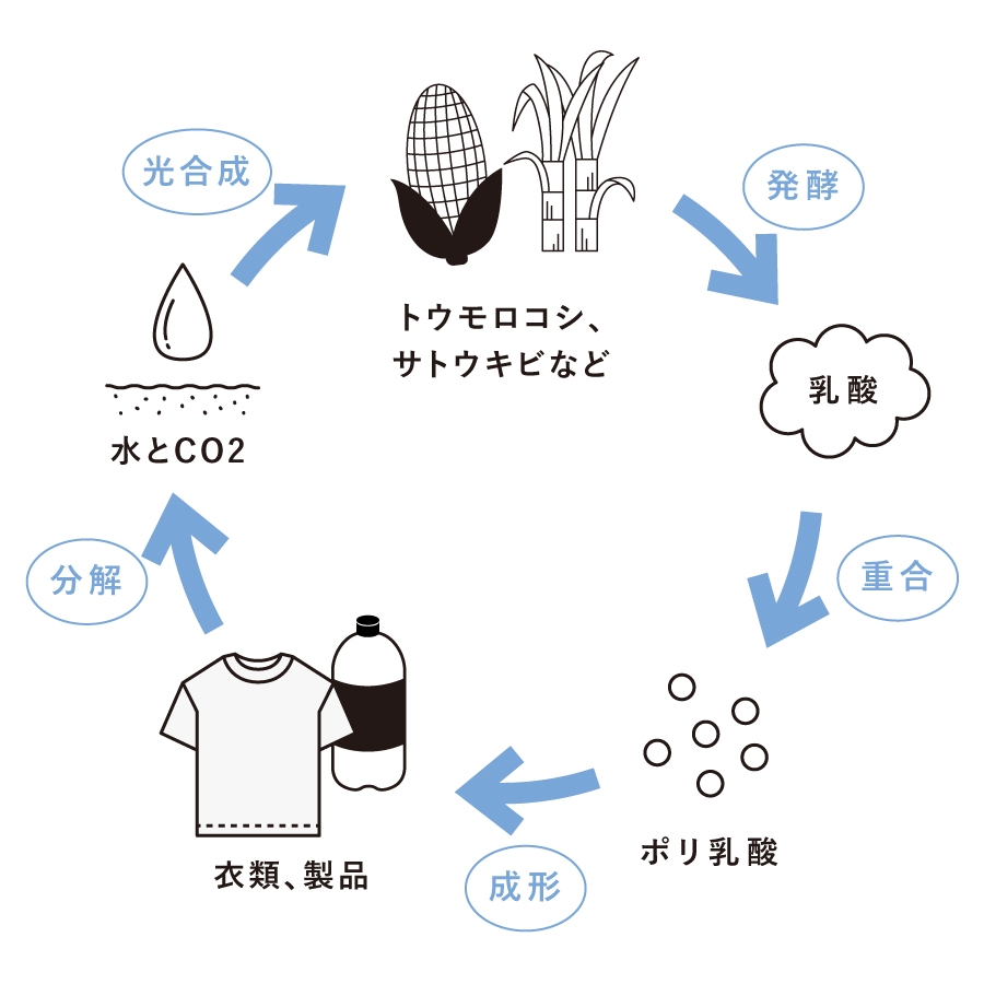 トウモロコシやサトウキビを原料としたPLA(ポリ乳酸)は、原料製造時のCO2排出量の削減に貢献。使用後は一定の条件で水とCO2に分解される生分解性の特徴を持つ、石油に依存しないバイオベース素材です。また環境配慮だけでなく、肌に優しい弱酸性や清潔に保つことができる抗菌・防臭効果も兼ね備え、人にも優しい次世代のサステナブル素材として注目されています。