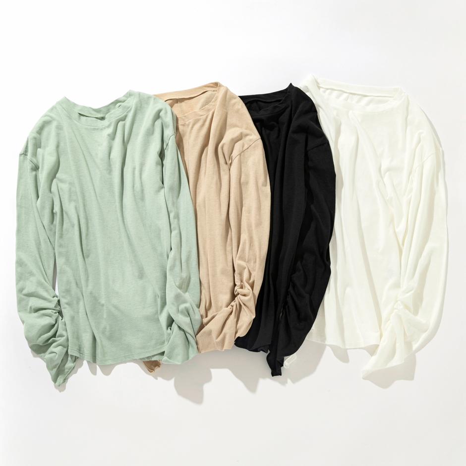 少しの透け感と袖口のギャザー使いが程よくフェミニンで大人っぽいTシャツ。ワンピースとのレイヤードもおすすめです。