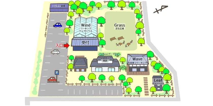 2,000坪の敷地内が貸し切りとなりますので、企業研修や組合交流会、レク企画、チームビルディング研修、節目のキックオフなど様々なシーンで気兼ねなくご利用いただけます。