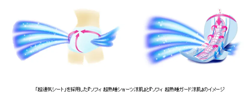 そこでこのたび、ムレが気になる季節でも快適な「通気シート」を採用した“涼肌”仕様のナプキンを『ソフィ 超熟睡』シリーズから期間限定品として全国発売することとしました。
