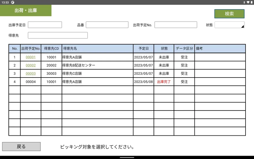 タブレット端末画面【出荷指示】