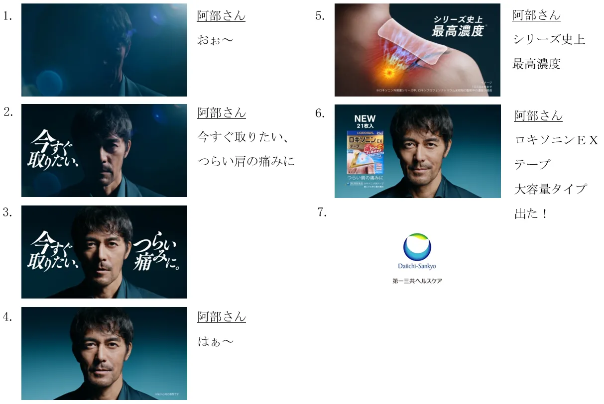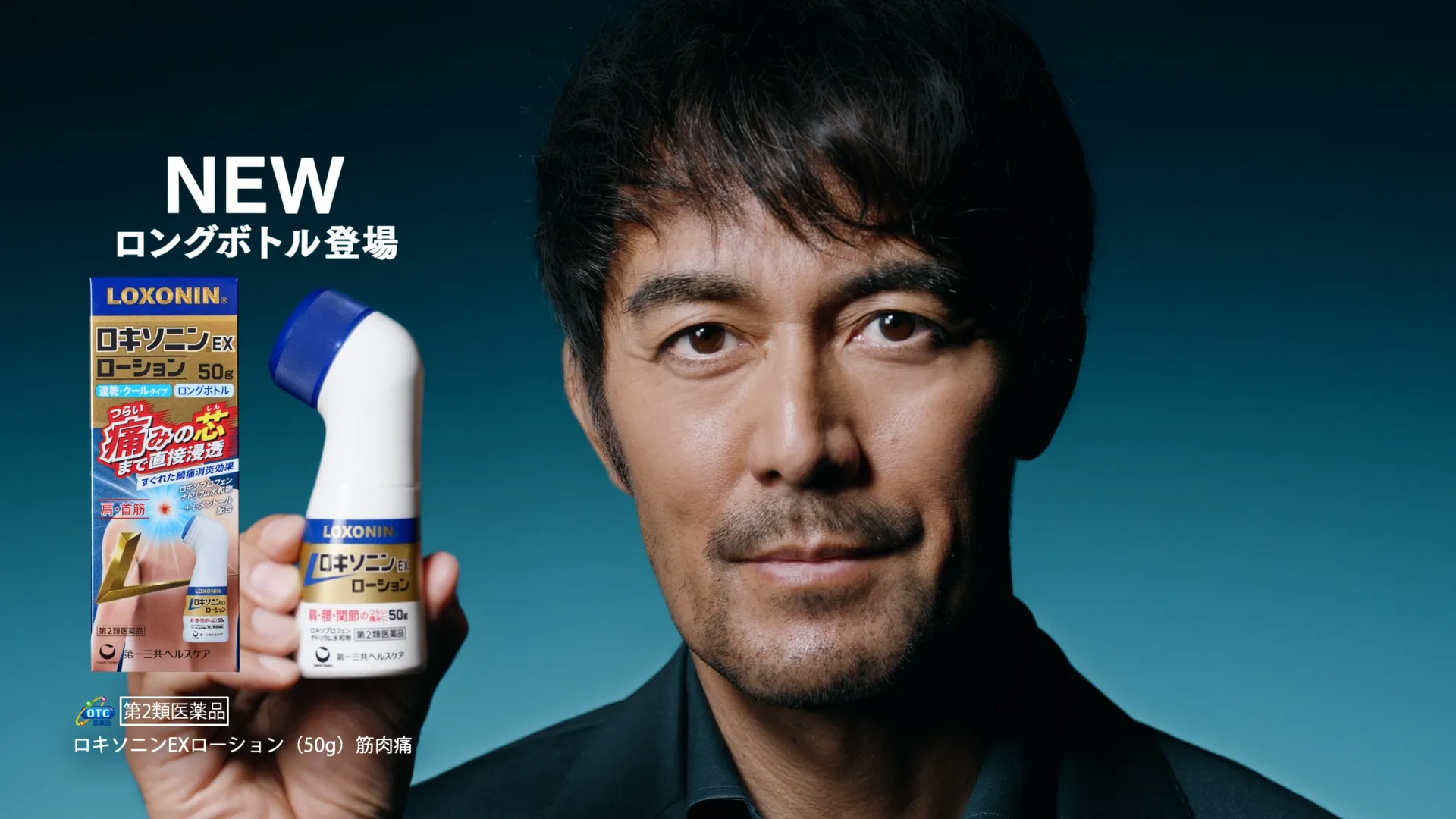 この度、肩・腰・関節のつらい痛みによく効く「ロキソニンEX外用薬シリーズ」より、大容量タイプ※1が新登場。新TV-CM「ロキソニンEXテープ『新たなる世界』」篇では、シリーズ史上最高濃度※2配合したテープの鎮痛消炎効果を、「ロキソニンEXローション『背中まで』」篇では、大きなロングボトルで、手の届きにくい背中まで塗りやすい新製品(ローション50g)を、阿部寛さんの圧倒的に大きな存在感で伝えます。表情と吐息で製品の特長を表現する阿部さんの迫真の演技にご注目ください。