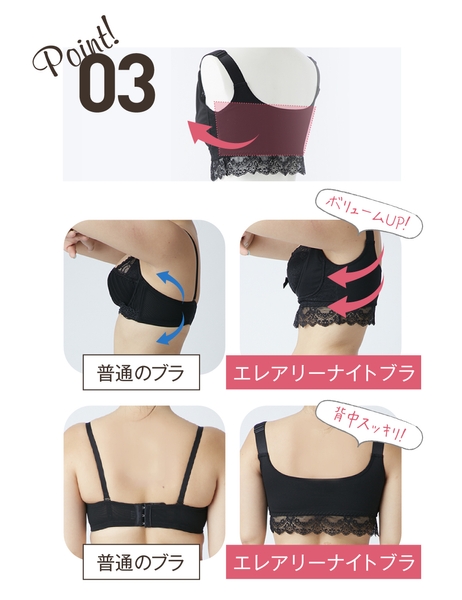 他のナイトブラにはないアジャスター付きで、バストを寄せるだけでなくしっかり上げて、寝ている間も上向き美バストをキープできます。