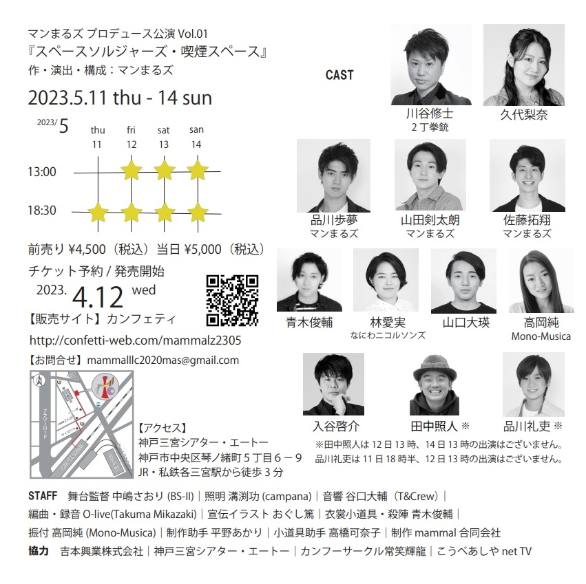 マンまるズ『スペースソルジャーズ・喫煙スペース』が2023年5月11日 (木) ~2023年5月14日 (日)に神戸三宮シアター・エートー(兵庫県神戸市中央区琴ノ緒町5丁目6-9)にて上演されます。