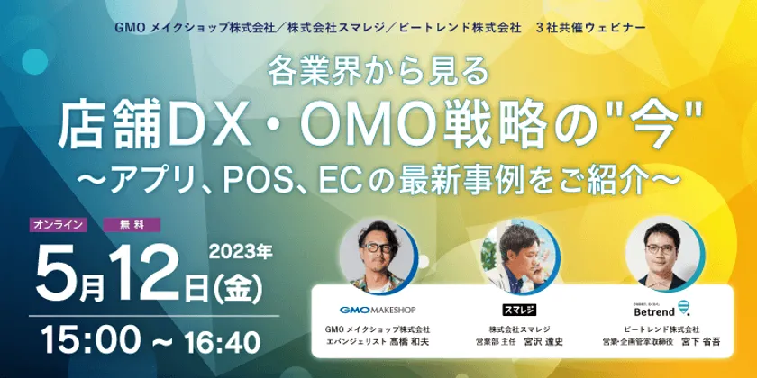 ビートレンド株式会社(本社:東京都千代田区、代表取締役社長:井上 英昭、以下、ビートレンド)とGMOインターネットグループのGMOメイクショップ株式会社(本社:東京都渋谷区、代表取締役社長CEO:向畑 憲良、以下、GMOメイクショップ)と、株式会社スマレジ(本社:大阪市中央区、代表取締役:山本 博士、以下スマレジ)は、2023年5月12日に、小売・外食企業様およびパートナー企業様を対象としたセミナー『各業界から見る、店舗DX・OMO戦略の“今”~アプリ、POS、ECの最新事例をご紹介~』を開催します。
