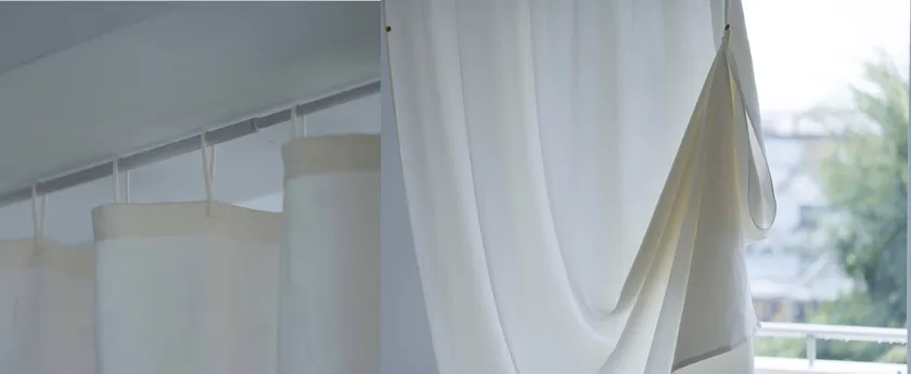 カーテンの製造過程で1日に出る廃棄生地は、全国で約3.4万t。それを解消するために生まれた『kami』を取り扱うブランド「KURASIKU(クラシク)」は、カーテンにプラスチックフックがなく生地に8つの穴をあけ布紐を通して掛けるスタイル(特許第6352496号)。ヒダやタッセルもないため、廃棄生地がほとんど出ない製造方法で作られています。