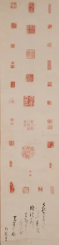 南畝が自身の蔵書や墨跡などに用いた印章34点を捺した軸。南畝没後に作られたとみられる。