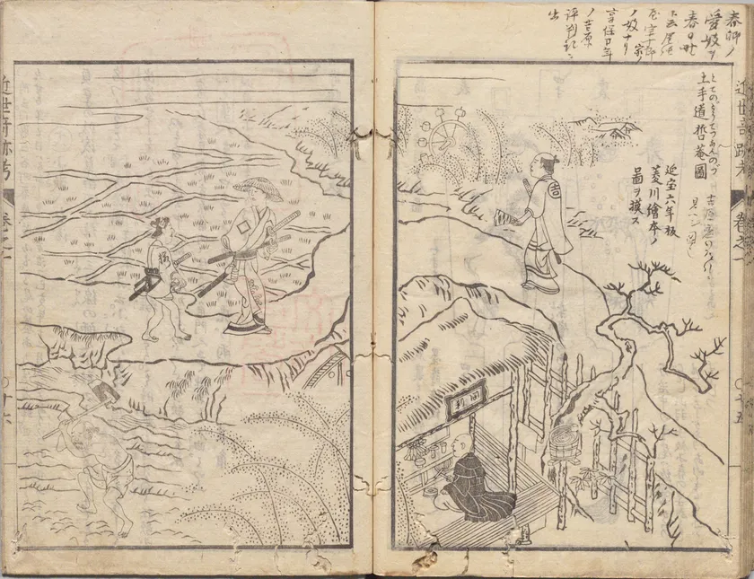 南畝の探究心は幅広く、伝統的な事物から、庶民の風俗・習慣の歴史まで及びました。中でも江戸の地理や、遊里を含む風俗・文化の成り立ちへの関心は強く、仲間の戯作者・山東京伝らを巻き込んで、懐古趣味と考証随筆の流行をもたらしました。