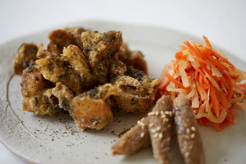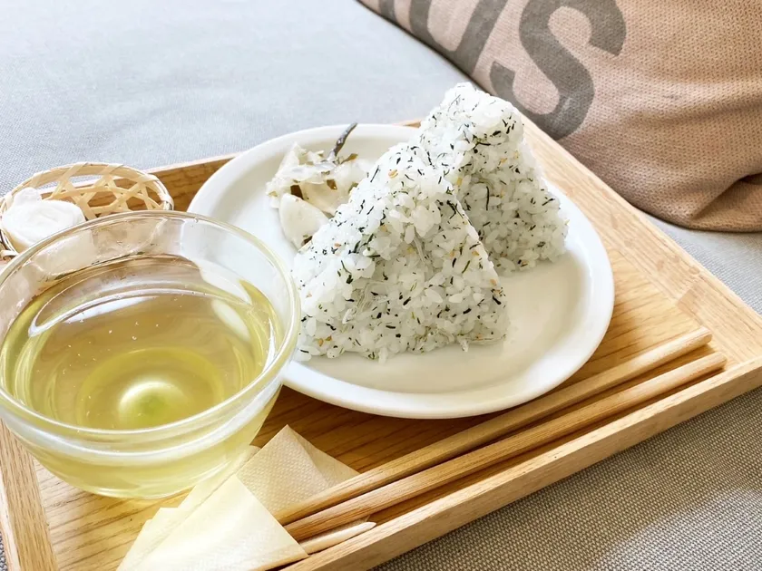 <お食事> おにぎり(おにぎり一個+おしんこ付き)、茶葉唐揚げ、