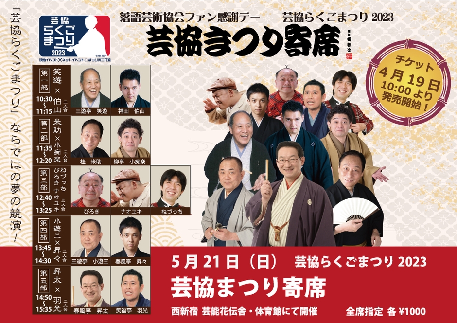 5月21日(日)新宿の芸能花伝舎(東京都新宿区西新宿6-12-30)で4年ぶりにリアル開催される芸協らくごまつり2023にて、「芸協まつり寄席」が開催されます。春風亭昇太、三遊亭小遊三、桂米助、神田伯山、ねづっちなど落語芸術協会の人気者が出演します。