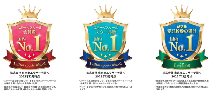 リーフラス株式会社(本社:東京都渋谷区、代表取締役:伊藤 清隆)は、2022年12月31日時点のスポーツスクール会員数・スクール数・部活動支援受託校数(累計)について調査を実施いたしました。その結果、すべての項目でNo.1を獲得いたしましたことをご報告いたします。