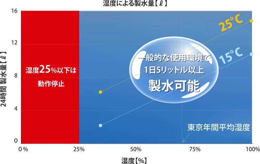 ・気温が25℃、湿度90%で一日当たり15リットルの水生成が可能(※4)