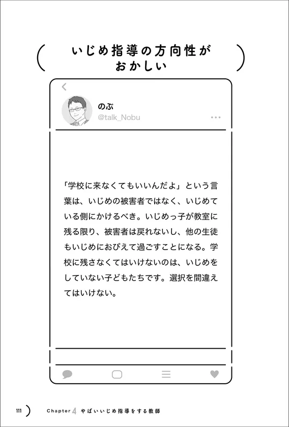 本書では、元公立中学校教師であり「教師のモヤモヤ」ツイッターで4万人(2023年4月現在)のフォロワーを持つ著者(のぶ @talk_Nobu)が、教育現場の問題点とその解決策を語ります。理不尽な学校に苦しむ先生や子どもたちが減ってほしいという著者の願いが込められた1冊です。