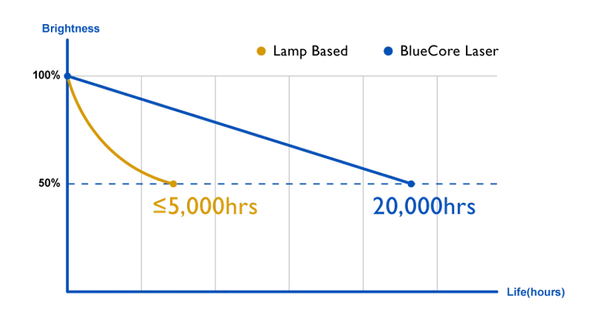 長期間使用後に黄ばんでしまう他の方式と異なり、耐久性に優れたDLPチップは交換不要で10万時間以上使用でき、幅広い用途で真の色味と鮮明な画質を実現します。ランプ交換後も購入直後のような色味でお使いいただけます。