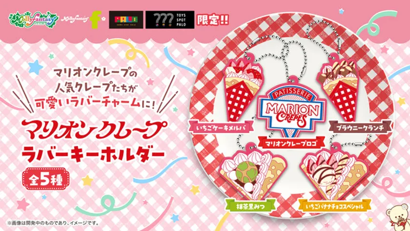 マリオンクレープで人気のクレープがかわいい「ラバーキーホルダー」になって登場。思わず食べてしまいそうなデザインです。いちごケーキメルバ、ブラウニークランチ、抹茶黒みつ、いちごバナナチョコスペシャル、マリオンクレープロゴの全5種を展開中です。