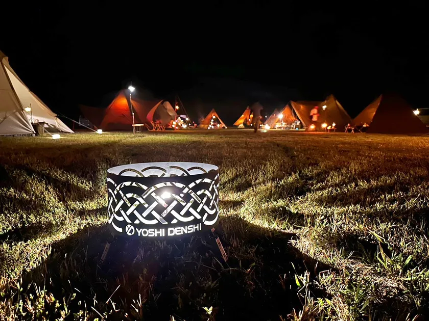 軽量設計でアウトドアに最適な小型LEDライトをグランピングストーブminiの薪投入口に設置することで、焚き火台に施されている模様が綺麗に浮かび上がることもできます。
