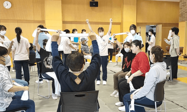 京都橘大学の学生たちがそれぞれに担当の高齢者と一緒に行動し、健康診断や、風船バレー、タオルでのトレーニングなど様々な高知で実際に高齢者と交流しました。
