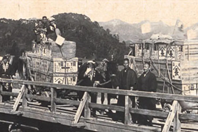 大正時代の新年初荷の風景・静岡県周智郡森町「森川橋」にて