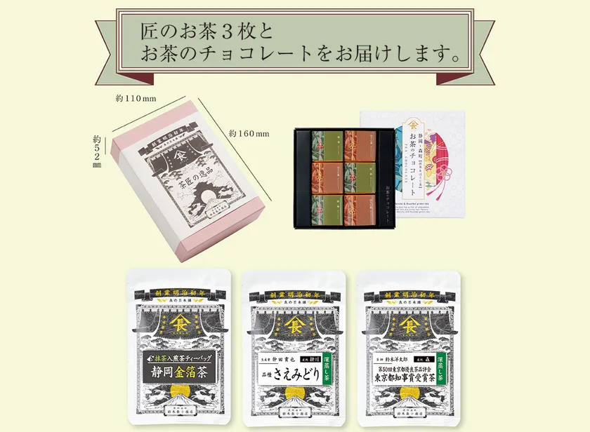 70種類を超えるシリーズの中から「茶審査技術」6段を持つ当店の茶師、鈴木洋太郎がセレクト。お茶好きなお母さんに喜んでいただけるよう、東京都知事賞を受賞した銘茶からマニア心をくすぐるような逸品まで、稀少なお茶と、お茶に合うオリジナルのチョコレートをセットにしてお届けします。