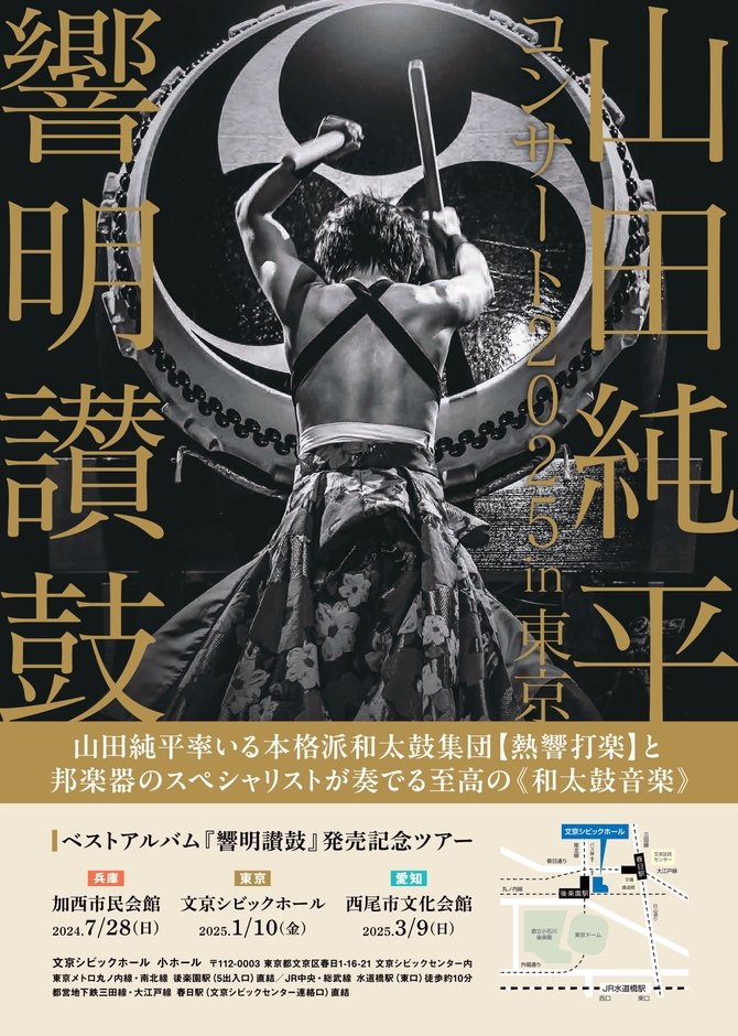 株式会社Studio燦 主催・企画・制作、響明讃鼓『山田純平コンサート2025 in 東京』が2025年1月10日 (金)に文京シビックホール 小ホール(東京都文京区春日1丁目16-21)にて開催されます。