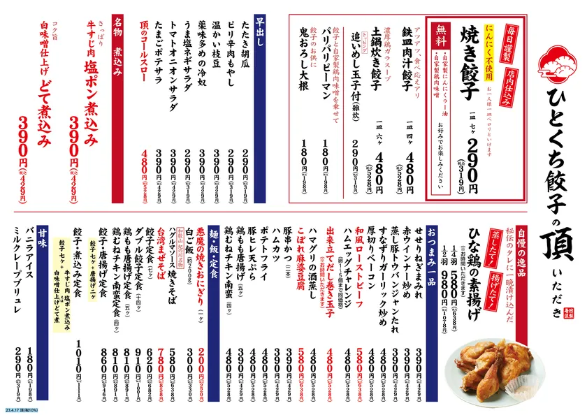 「ひとくち餃子の頂」では、ちょい飲みにも、家族での外食にも、テイクアウトにもぴったりな「ひとくち餃子」を毎日お店で手仕込み。焼き餃子一皿7ヶで319円(税込)の他にも、秘伝のタレに一晩漬け込んだひな鶏を、蒸した上で揚げて提供する「ひな鶏の素揚げ」や「出来立てだし巻き玉子」、「牛すじ肉塩ポン煮込み」などの特製の一品やつまみも各種ご用意。お一人様でも気軽に入れるカウンター席の他に、奥にはグループのお客様でもワイワイ楽しめるテーブル席もご用意しております。お酒をあまり飲まれない方でも、餃子定食682円(税込)や鶏もも唐揚げ定食891円(税込)などの各種定食メニューもご用意しております。ドリンクメニューには飲めば飲むほど、どんどん安くなる「どん安」システムもご用意!さらに土日祝も含めて毎日、15時のオープンから18時までの3時間は、ハッピーアワーも実施!焼き餃子一皿を198円(税込)でご提供するほか、どん安も2杯目価格からのスタートで更にお得!皆さんに笑顔と元気を持って帰って頂けるよう、元気に営業してまいります!