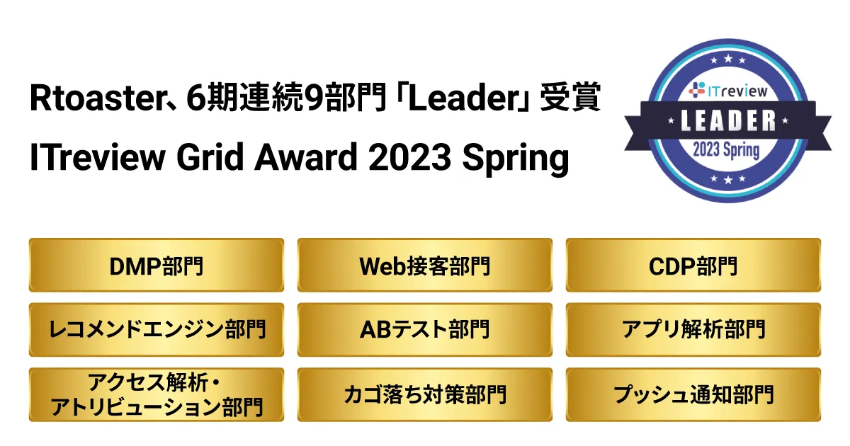 株式会社ブレインパッドは、顧客一人ひとりに自然なアクションを促す、Web/アプリのコンテンツ最適化プラットフォーム「Rtoaster(アールトースター)」が、アイティクラウド株式会社が運営するIT製品レビュープラットフォーム「ITreview」のアワード「ITreview Grid Award 2023 Spring」にて、6期連続9部門で「Leader」を獲得したことを発表いたします。