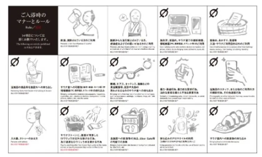入浴・サウナ以外のご利用(染髪、あかすり、洗濯等)、投資施越の備品等を施設外への持ち出し、変形や火傷の恐れがあるもののサウナ室への持ち込み(眼鏡、ピアス、ネックレス、指輪など)、暴力・脅迫行為、暴力的な要求行為、法的な責任を超えた不当な要求行為、サウナストーンへのいたずら(施設が用意したロウリュウ水以外をかける行為、及び過度なロウリュウ水を掛ける行為、持ち込みアロマオイルの利用、過度な水かけ等)、当施設への飲食物の持込、Uber Eats等の宅配での食事、サウナ室内への飲食物の持ち込み。