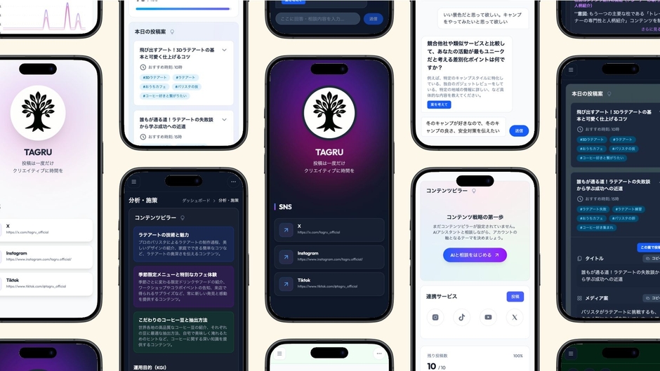 2025年12月、忙しい個人事業主や中小企業オーナー向けに、SNS運用をAIがトータルサポートするサービス「TAGRU(タグル)」を正式リリースしました。