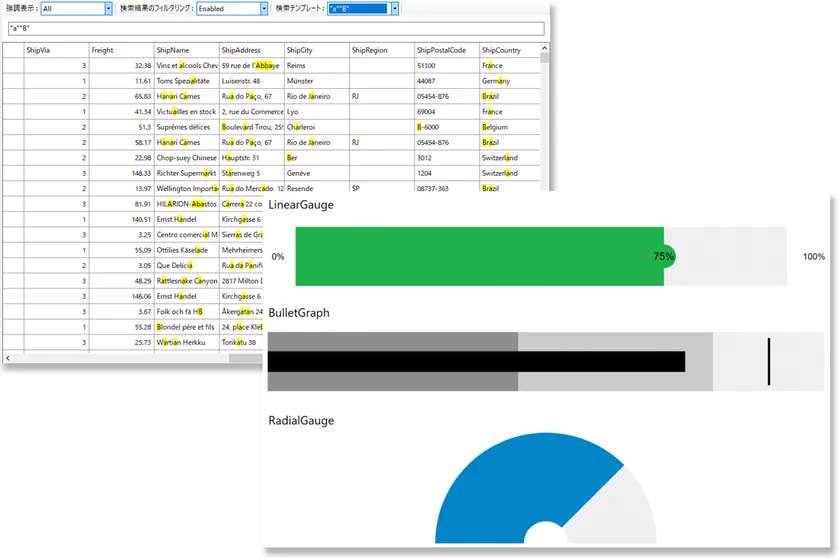 このほか、WPF用エディションでは「.NET 6」に対応したGaugesコントロールを追加しました。さまざまな形状のゲージを利用して情報をグラフィカルに表示することで、進捗や割合などを直感的に把握できるようになります。