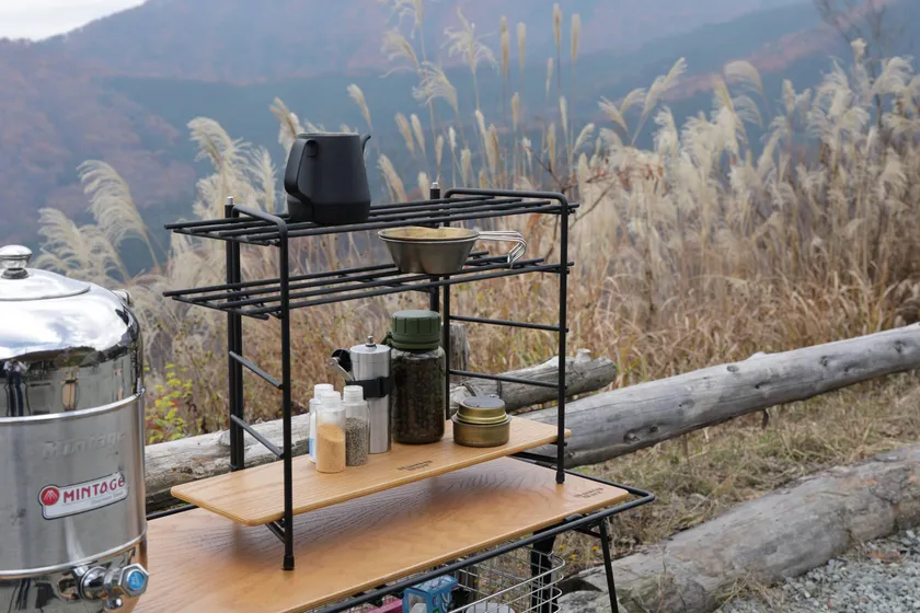 “SOT Field Rack/エスオーティー フィールドラック”は、キャンプの時に小物ギアやスパイスを並べられるアウトドアラック。
