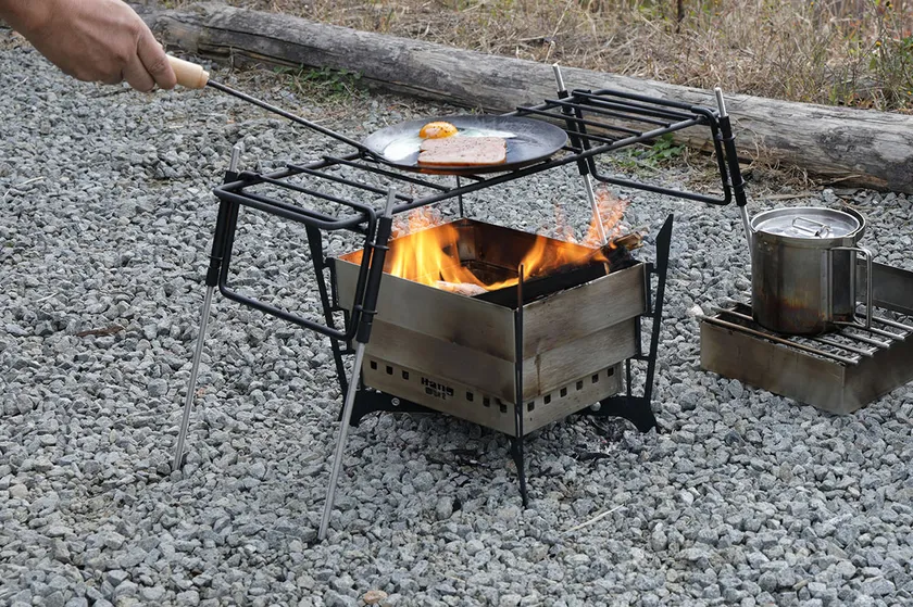 ロストル状の天板はナノセラミックコーティングを施した耐熱素材で、焚き火をしながらアウトドア調理も一緒に楽しめます。