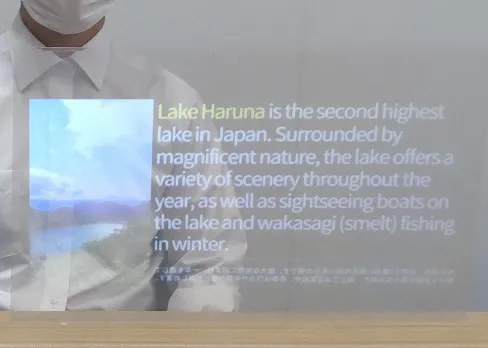 話した内容がリアルタイムにスクリーンに文字として表示されるので、マスク着用時やアクリル板を通した会話であっても、文字や図解、動画という視覚情報で伝えることが可能なシステムです。今回、G7参加7ヵ国の言語の翻訳にも対応しています。