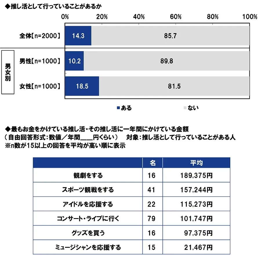 まず、推し活として行っていることがあるか聞いたところ、「ある」は14.3%、「ない」は85.7%となりました。“推し活”をしている人は少なくないようです。