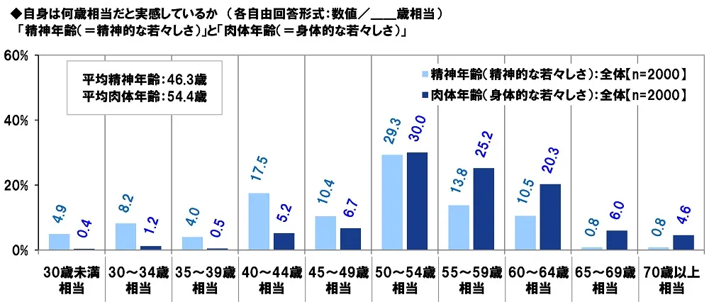 「身体的な若々しさ」の実感でも、「50~54歳相当」(30.0%)に最も多くの回答が集まり、平均年齢は54.4歳でした。