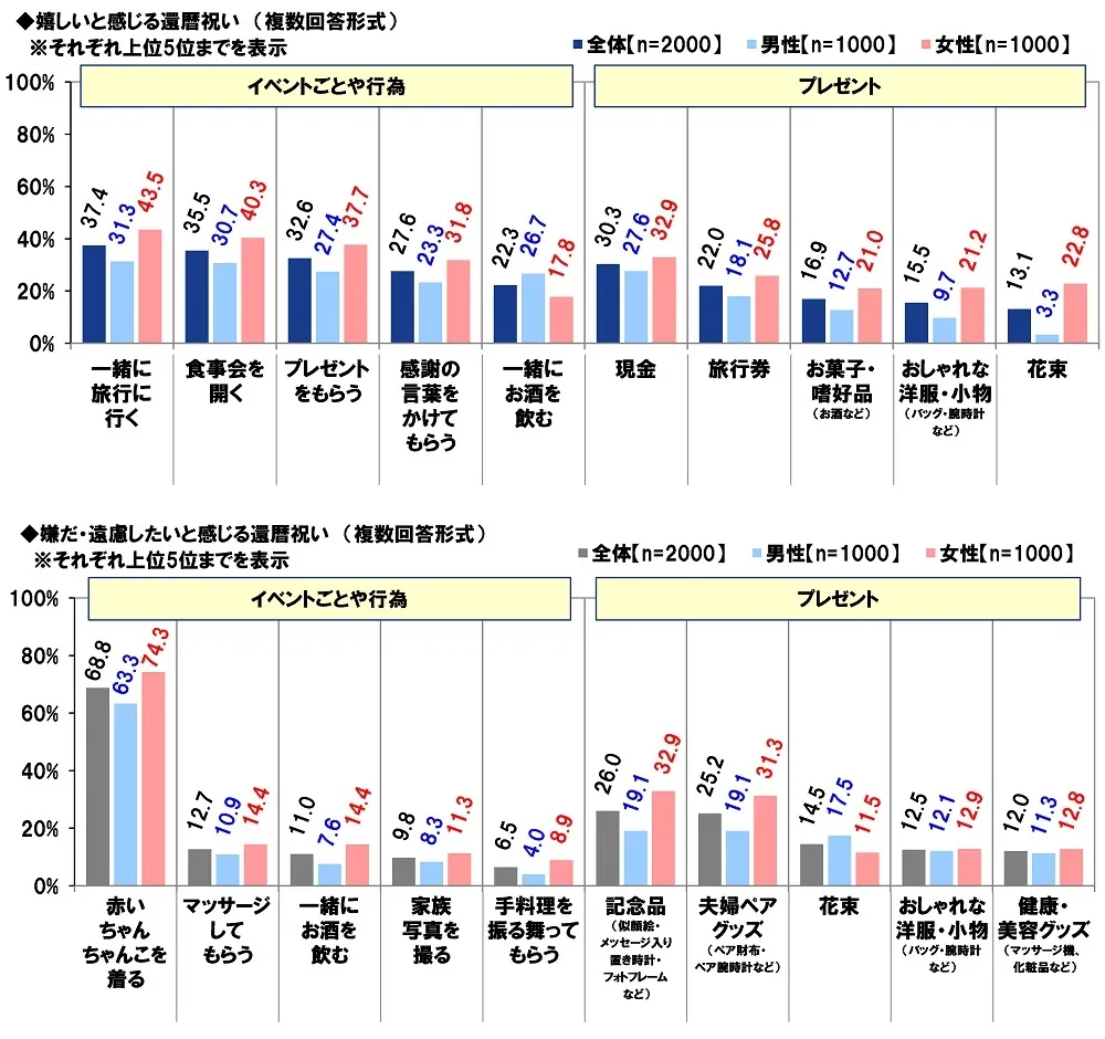 反対に、嫌だ・遠慮したいと感じる還暦祝いを聞いたところ、イベントごとや行為では「赤いちゃんちゃんこを着る」(68.8%)がダントツとなり、2位「マッサージしてもらう」(12.7%)、3位「一緒にお酒を飲む」(11.0%)が続きました。プレゼントでは1位「記念品(似顔絵・メッセージ入り置き時計・フォトフレームなど)」(26.0%)、2位「夫婦ペアグッズ(ペア財布・ペア腕時計など)」(25.2%)、3位「花束」(14.5%)でした。