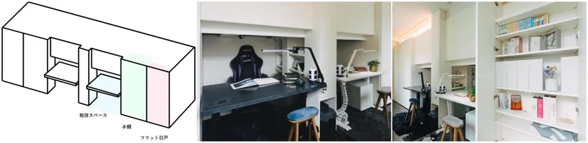 「間仕込」を設置すれば、一つの部屋に二つの子供部屋をつくることができます。下図は限られた空間を「上下」に使った一例です。外側から見ると勉強スペースと本棚となっていますが、内側には外側から見えていた勉強スペースの「上」の空間にベッドがあり、さらにベッドの手前側の「下」の空間にはクローゼットがあります。このように「間仕込」を使って、まるで秘密基地のような子供部屋をつくることもできます。