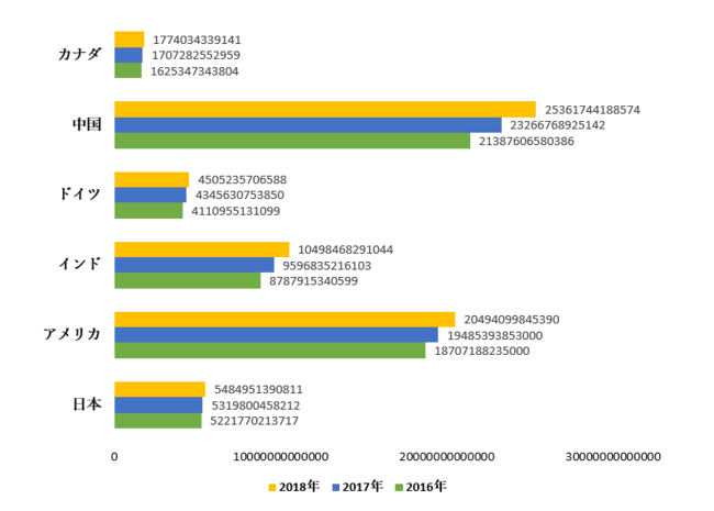購買力平価でのGDP(国際ドル)、2016ー2018年