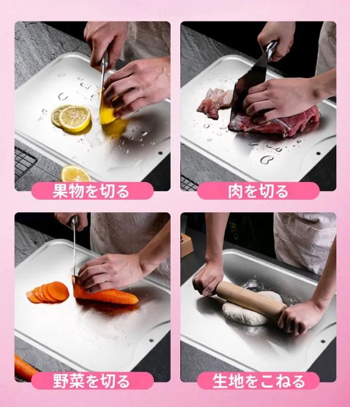 【純チタン製まな板】は、多機能で衛生的、まさに理想的なまな板です。優れた耐久性でずっと大事に使えて、抗菌性で気持ちよく清潔にカットすることができます。食材の油や汚れがこびりつかないので、中性洗剤で洗い流すだけで、簡単にキレイになります。