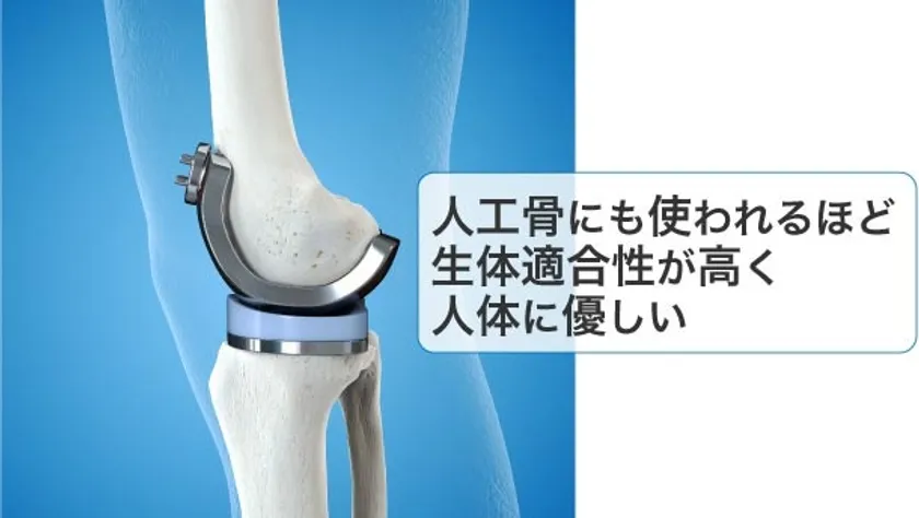 チタンは、金属への不適合な反応などを起こしにくい、人工骨にも使われる、無害で生体に適合性がある金属です。