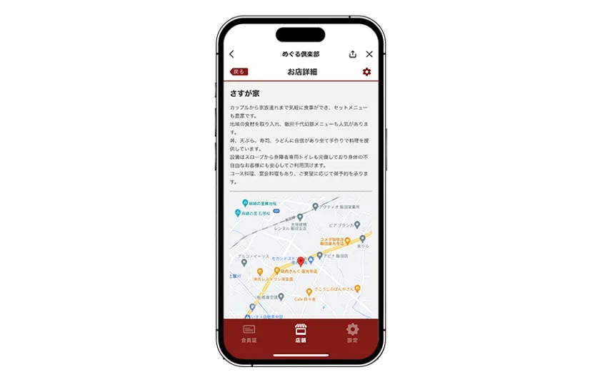 LINEミニアプリ『【LINE版】めぐる倶楽部』は、マツザワグループが運営する飲食店『さすが家』『かなえ茶屋』『満月や』共通の会員向けアプリです。『LINE』のユーザーであれば二次元コードやURLを通じてアクセスし、新規にアプリをダウンロードすることなく『LINE』上で、簡単に会員登録できます。会員登録が完了すると画面上に会員証が発行され、当日のお会計のポイントを貯めてお帰りいただけます。