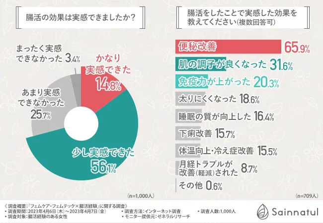 便秘の改善、肌の調子が良くなった!70%の方が腸活の効果を実感!
