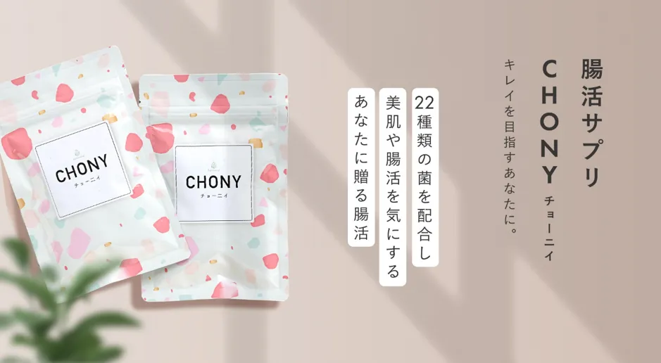 CHONY(チョー二イ)は腸にフォーカスし、従来の16種類の乳酸菌生産物質に追加して6種類の菌(ビフィズス菌、ラクリス菌、植物性乳酸菌、納豆菌、酪酸菌、ガセリ菌)配合し、合計22種類の菌が入ったサプリメントとして新たに誕生しました。