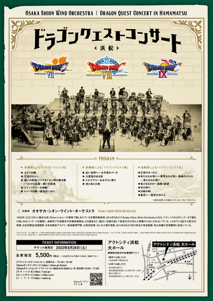 各地で完売続出となっているOsaka Shion Wind Orchestraによるドラゴンクエストの公式吹奏楽コンサート。「ドラゴンクエストⅦ エデンの戦士たち」「ドラゴンクエストⅧ 空と海と大地と呪われし姫君」「ドラゴンクエストⅨ 星空の守り人」3シリーズの美味しいとこどりのプログラムが浜松で実現!